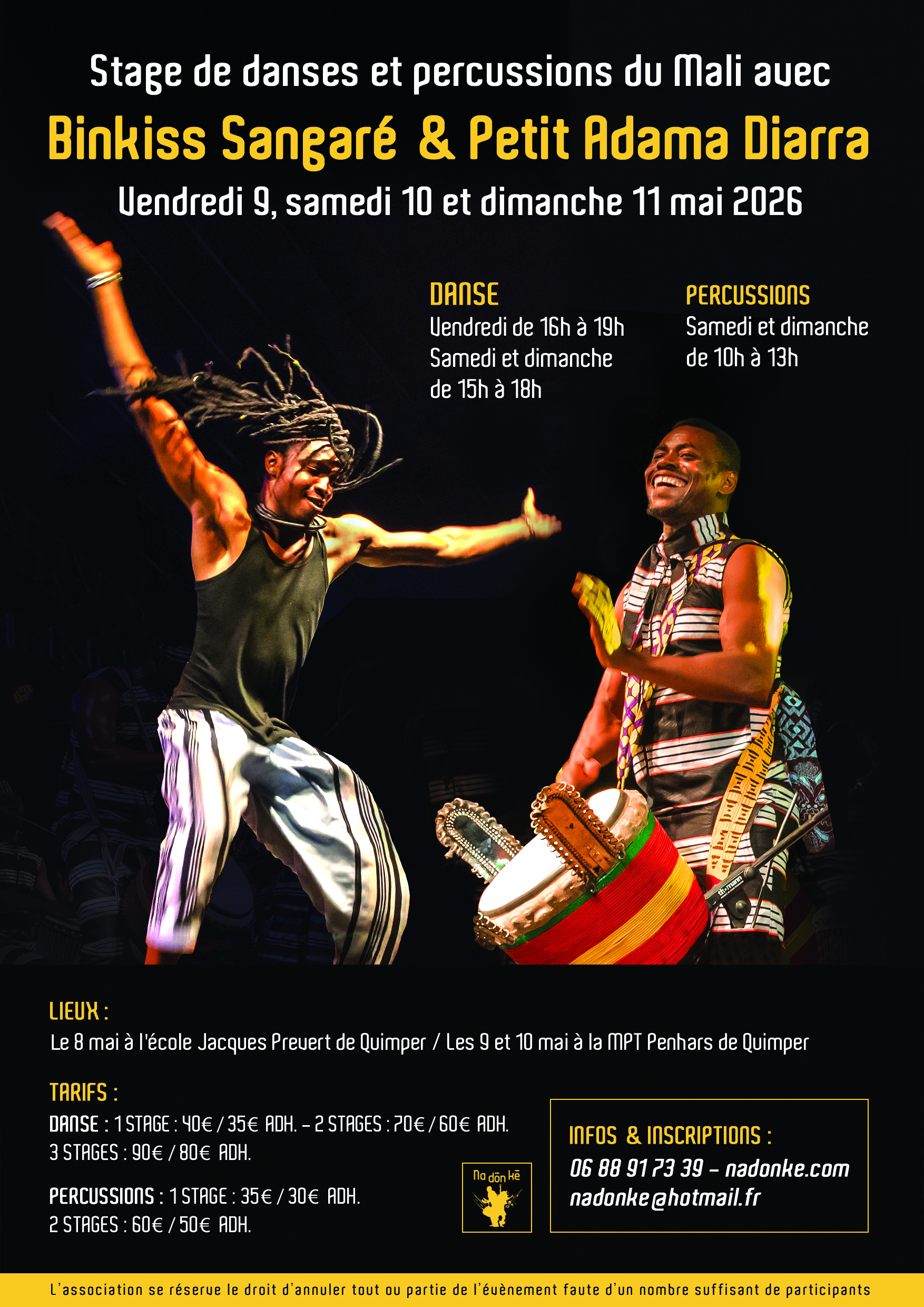 Nous avons l’honneur d’accueillir pour la première fois en Finistère le danseur malien Binkiss Sangaré qui sera accompagné, pour ces 3 sessions de stages, par les percussionnistes de l’association dirigés par Petit Adama Diarra qui encdrera lui-même 2 sessions de stages de percussions mandingues (djembé et dundun) le samedi et le dimanche matins.